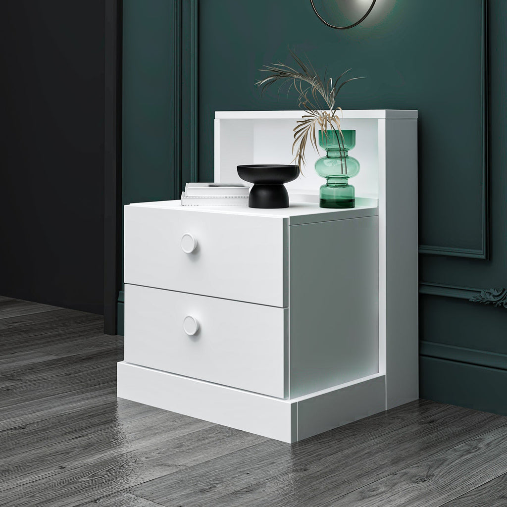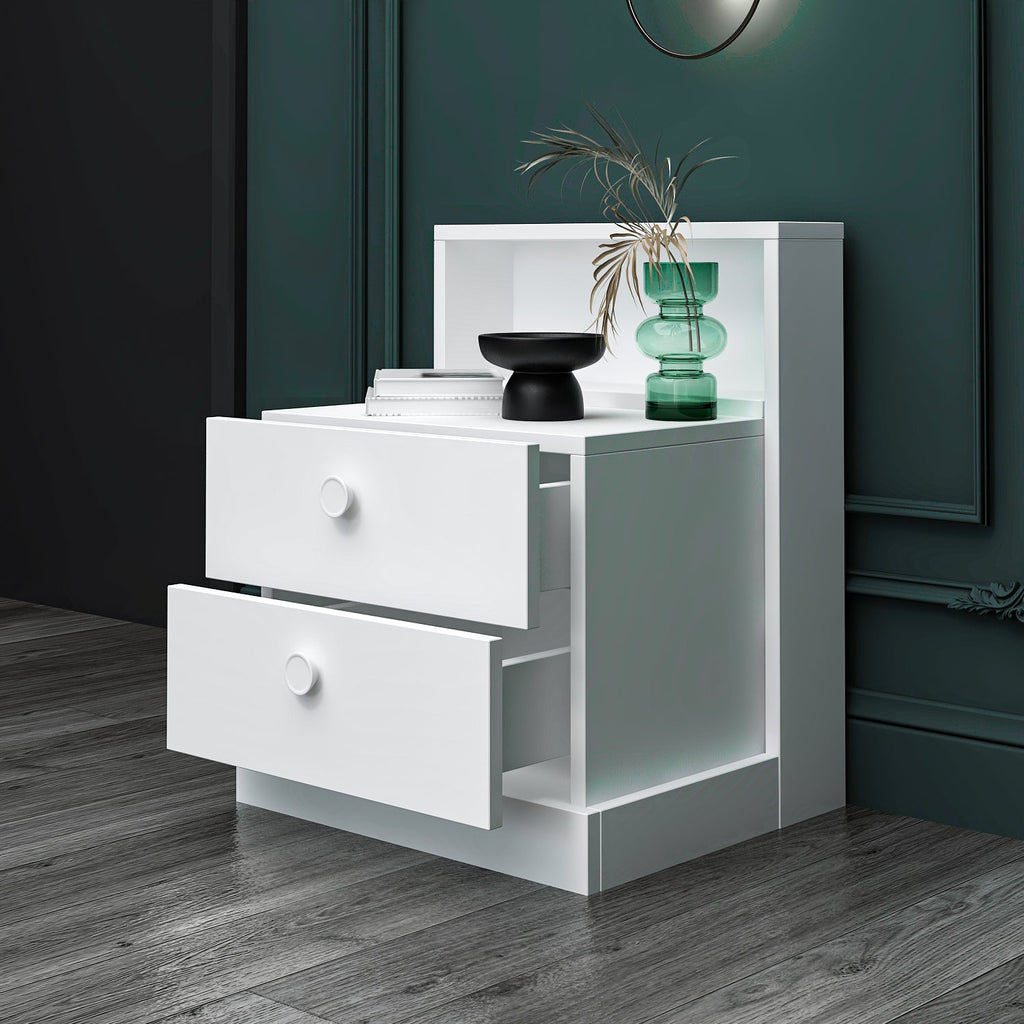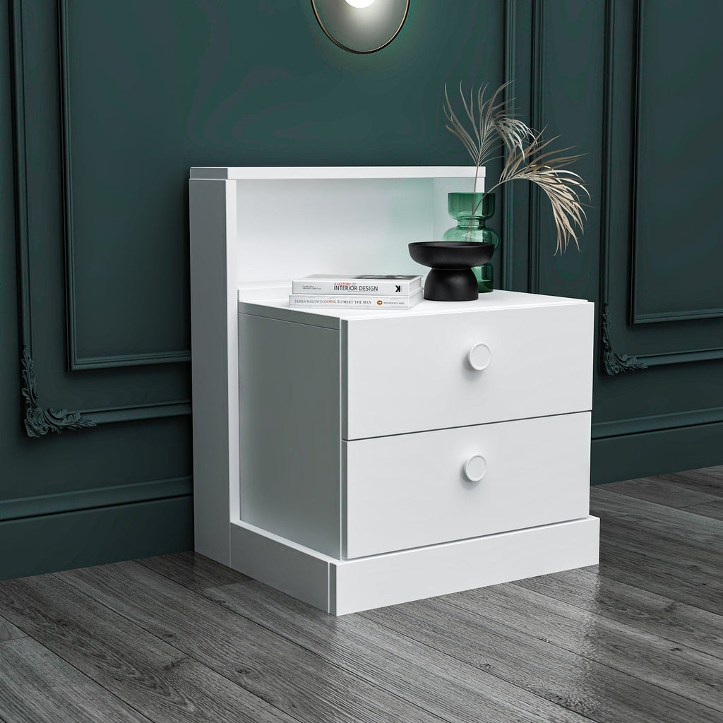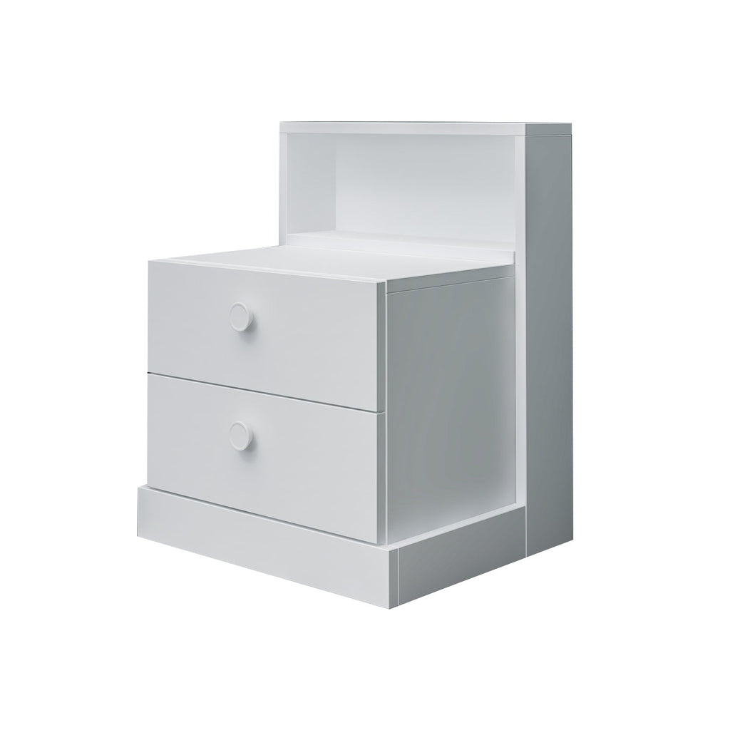 Der Life Nachttisch verleiht Ihrem Schlafzimmer zeitlose Eleganz und Ordnung. Erhältlich in den modernen Farbvarianten Weiß und Weiß-Anthrazit, passt er sich mühelos jedem Einrichtungsstil an. Gefertigt aus hochwertiger, melaminbeschichteter Spanplatte, bietet er Langlebigkeit und Stabilität. Mit zwei geräumigen Schubladen und einer praktischen oberen Ablage ist er ideal, um persönliche Gegenstände ordentlich zu verstauen und Bücher, Wecker oder Dekoration stilvoll zu platzieren.